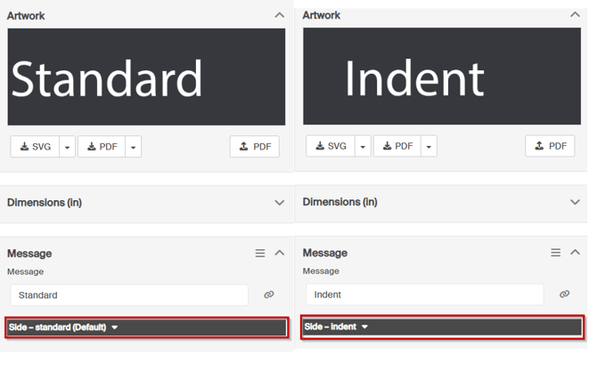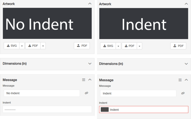 The options feature allows for multiple sets of rules to be considered in a template and then selected individually for each artwork. Create an option for the standard and indented version of the messaging which will allow users to toggle between the two rulesets. Read more about options in this article
