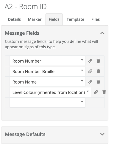 Message Fields - These fields outline the content of the sign itself, and can include things like Room Name, Room Number, Level, Pictogram, Stair Number, Parking Zone, etc.