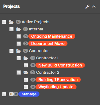In the example below, the active projects are separated as projects being worked on internally and those being run by vendors. If the project being created was being helmed by Contractor 2, right click on the "Contractor 2" folder and select "New Project"